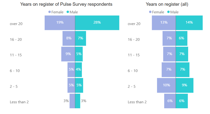 We recognise that it is important to hear from the whole profession, so this result (particularly when compared to the profile of the whole register on the right) highlights we need to do more to hear from people who have been registered for a shorter period of time.