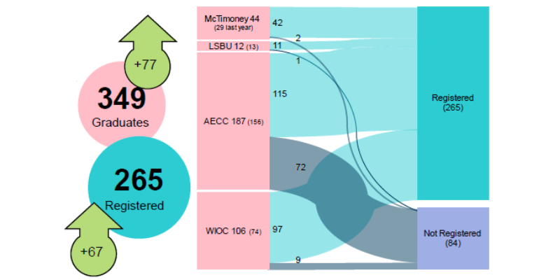 By 12 February 2024, 265 that had graduated from a UK approved degree courses in chiropractic had registered with the GCC. We measure to the date in February as some courses complete in December and the students on these courses tend not to register immediately.